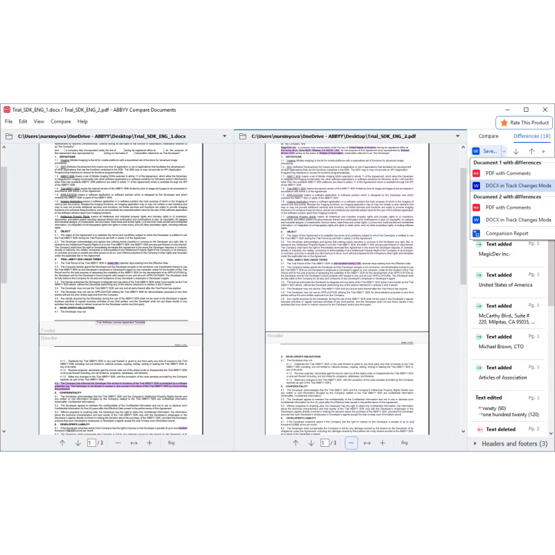 Быстрое, точное и простое сравнение документов. Забудьте об утомительном сравнении двух текстовых документов вручную. ABBYY FineReader 16 автоматически обнаруживает разницу между двумя версиями документа в считанные секунды. Для этого не нужно распознавать и конвертировать файлы, даже если вам нужно сравнить документы в разных форматах.
