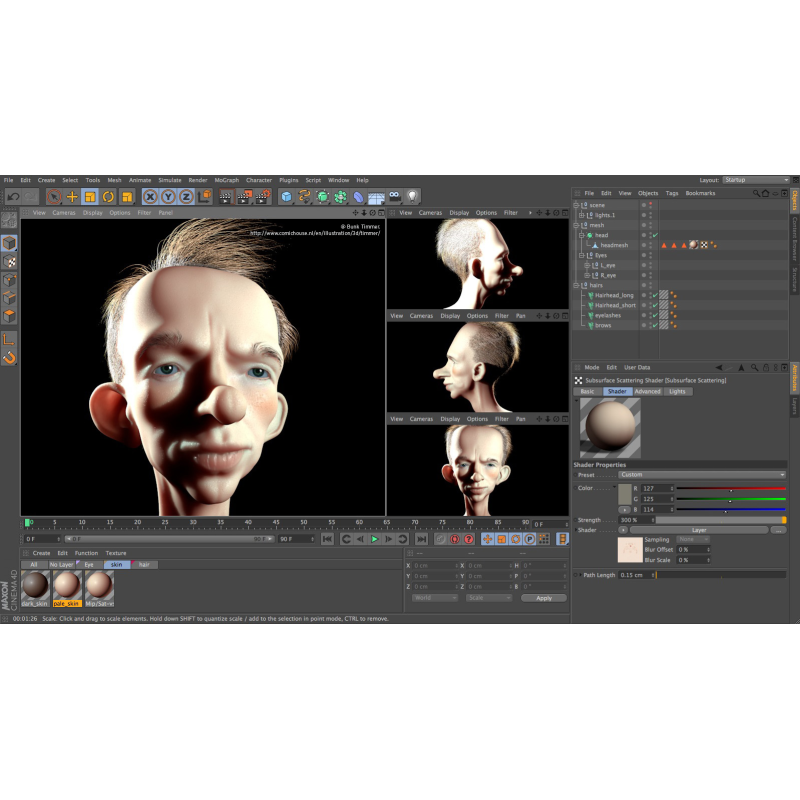 Специальные инструменты CINEMA 4D Studio упрощают создание ковров и дополнительную анимацию персонажей. Волосы или мех для персонажей можно быстро и просто добавить, используя мощный набор инструментов, который позволит вам нарастить, зачесать, стилизовать и анимировать волосы. Физический двигатель позволяет легко реализовывать сложные столкновения и взаимодействия между объектами, независимо от того, десяток их или тысячи. Рендеринг по сети позволяет использовать все компьютеры в сети, чтобы просчитать анимацию быстрее.